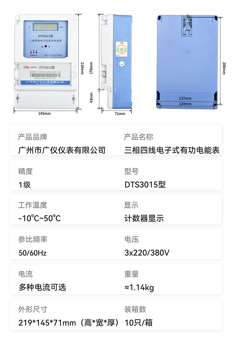 DTS3015型三相四线电子式有功电能表是电子式1.0级和2.0级有功电能表,用以测量参比频率50HZ交流电路中三相有功电能,全部符合国家标准GB/T17215.321-2008,它的特点是: